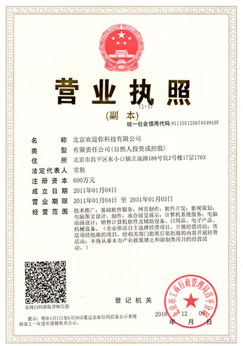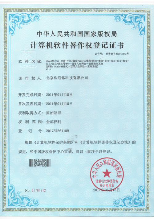 北京歡迎你科技有限公司獲得多項(xiàng)版權(quán)局"計(jì)算機(jī)軟件著作權(quán)登記證書(shū)",并已獲得“全國(guó)誠(chéng)信經(jīng)營(yíng)示范單位”、“全國(guó)質(zhì)量服務(wù)客戶滿意誠(chéng)信企業(yè)”和“全國(guó)重合同守信用品牌企業(yè)”等榮譽(yù)稱號(hào)。